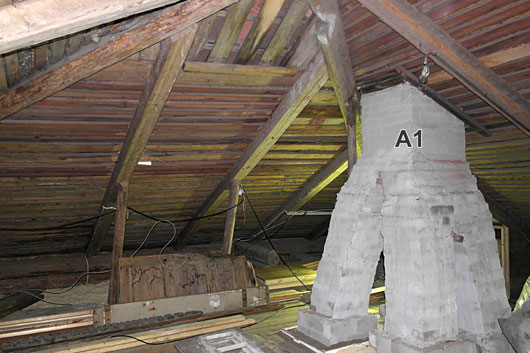 Savupiippu (A1) näkyy hormeineen tässä vintin kuvassa sekä tietysti ulkoseinien puolella: 1500 €