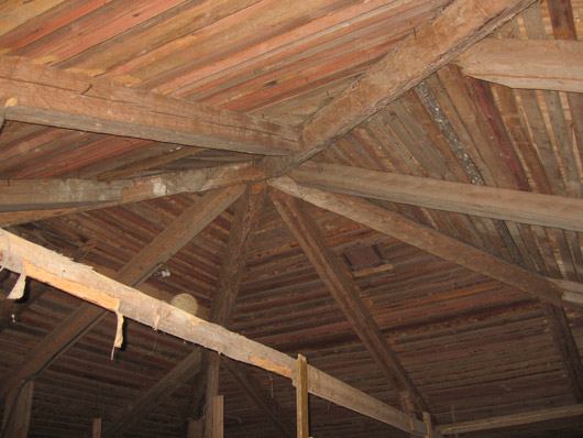 Katonmyötäiset ristiin menevät kattopalkit, kattolaudat ja täytteenä olevat päreet