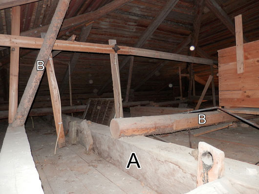 Pitäjäntuvan paksuin hirsi, johon Salin kattopalkit on pultattu kiinni.
